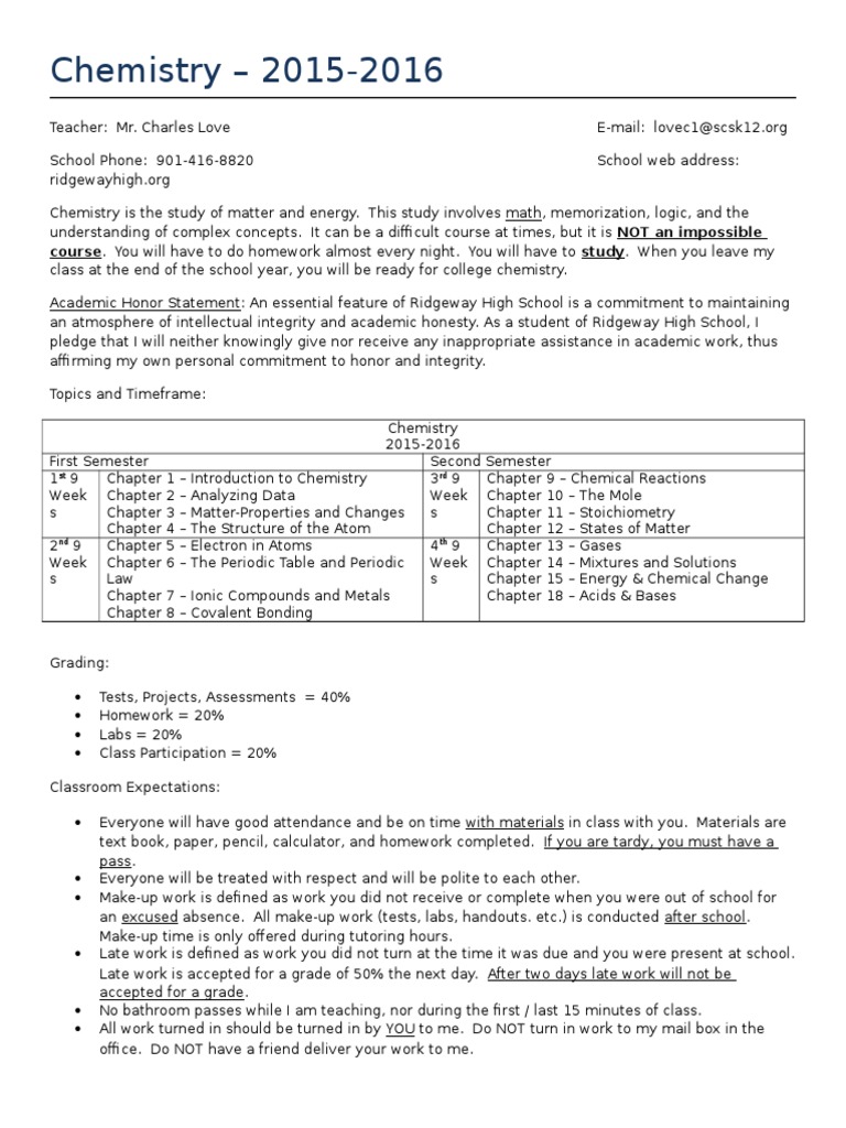 chemistry syllabus and parent agreement Chemical Compounds Chemistry